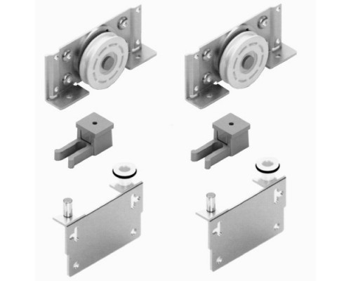 Система с нижним несущим механизмом для дверей весом до 80 кг. Комплект на одну дверь включает два нижних ролика на подшипниках с полиамидным покрытием, два верхних направляющих ролика с полиамидным покрытием и два верхних стопора. В данном комплекте уже в наличии комплектующие на 2 двери.