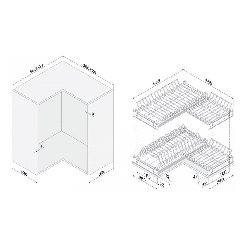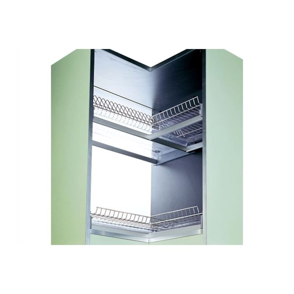 Надежная и вместительная сушка встраивается в угловой кухонный шкаф. Каждая полка оснащена пластиковым поддоном. Полки изготовлены из хромированной стали.