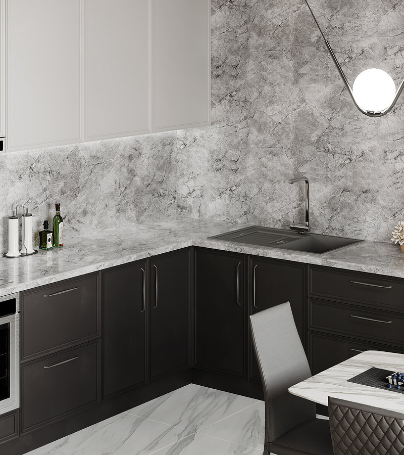 Представьте, что смотрите на замерзшее озеро с высоты птичьего полета. Плавные переходы оттенков серого, едва заметные прожилки и узоры, создающие ощущение глубины и движения. Такое впечатление производит этот декор. Столешница словно оживает под разным освещением, раскрывая новые грани своего рисунка.