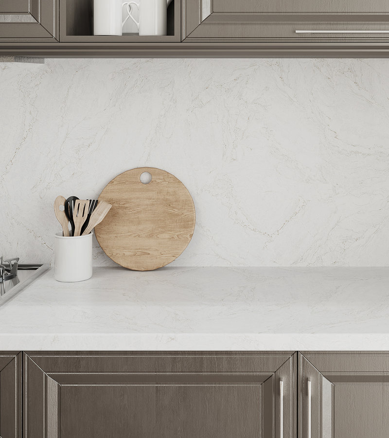 Тонкие бежевые узоры на белом фоне добавляют глубину и текстуру поверхности, не перегружая пространство.